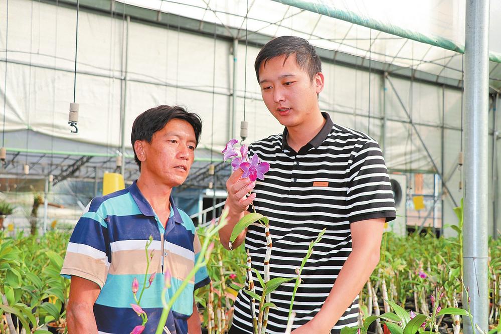 蒋德凡(右一)与花农一起探讨石斛花卉种植技术。云南日报通讯员 徐静 摄