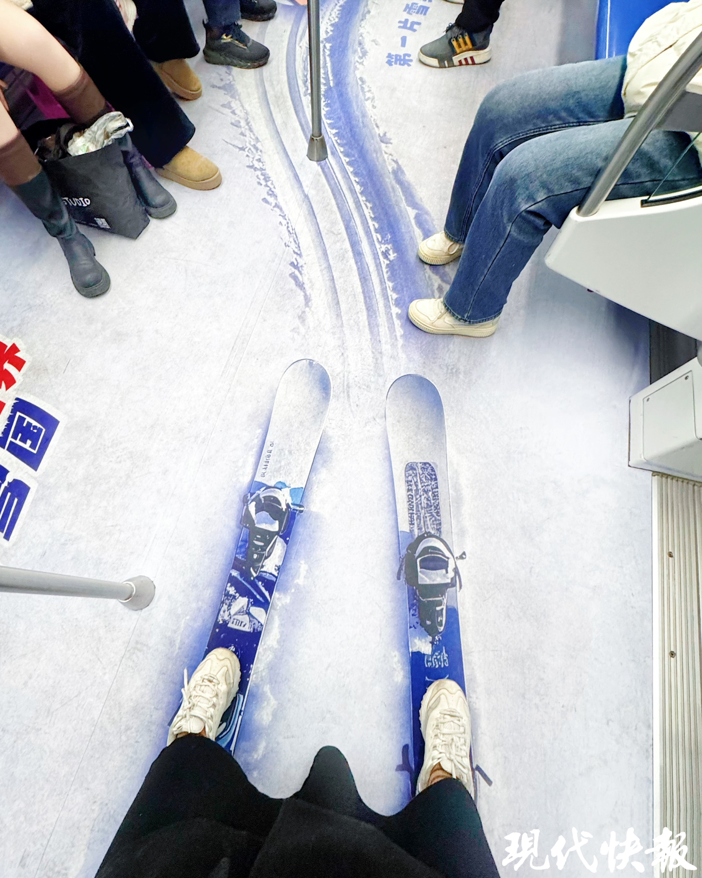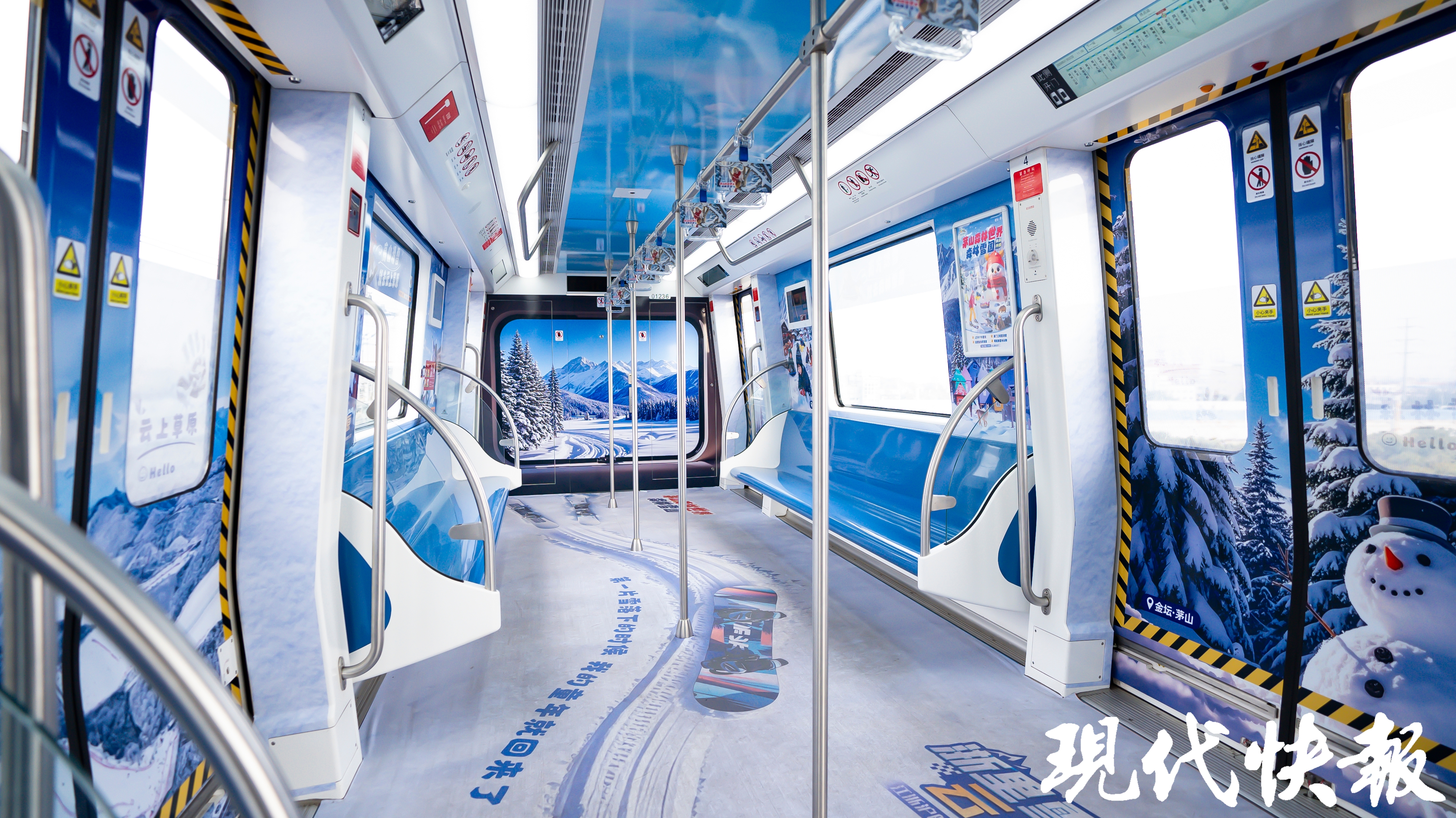 车厢内,经典蓝白配色的“仿真雪场”内饰,有各种戏雪、玩雪及雪地动物的画面,置身其中,仿佛一下穿越到了北国,每一个角落都充满了浓浓的冬日风情。车厢地面犹如“滑雪场”,还特别设置了滑雪板画面,站在上面,好像真的在滑雪一样,冰天雪地的氛围感拉满。