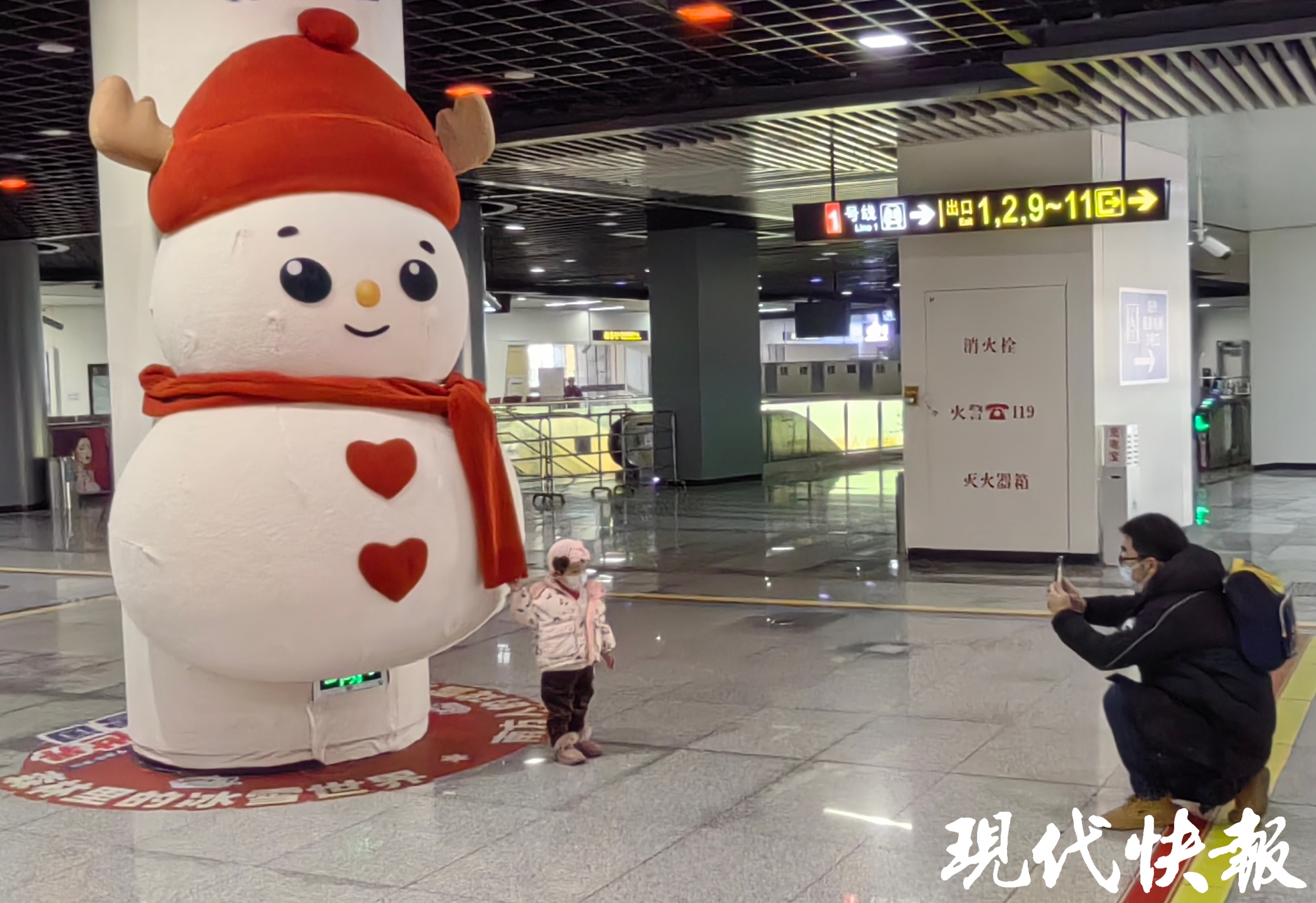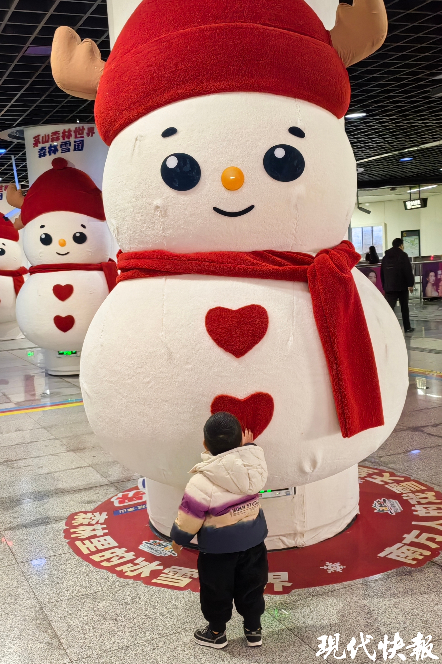 现代快报记者了解到,“雪国列车”主题地铁由茅山森林世界、安吉云上草原联合常州地铁共同打造,此次除了主题地铁外,还在文化宫地铁站打造了主题车站。车站中庭区域,一个个萌态可掬的“巨型雪人”和“滑雪女孩”十分有趣。