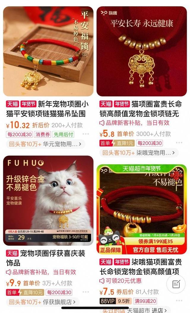 “快过年了,家人们给毛孩子安排一个平安金锁项圈吧,寓意吉祥如意平平安安,带上精致好看又喜庆。”短视频平台上,一位广东卖家一边展示一只博美带着项圈的照片,一边叫卖着自家的产品。照片中,毛茸茸的博美犬带着红色的项圈金色挂坠,昂着头“得意洋洋”格外好看。潮新闻记者发现,今年过年,宠物饰品赛道格外“卷”,长命锁、平安扣、幸运绳等产品层出不穷,有些商家甚至还会为消费者提供免费的刻字定制服务。平台显示,目前线上销售的宠物类首饰大部分以项链为主,主要材质为钛钢、仿珍珠、仿黄金、编织绳,此类产品的价格从几元至十几元不等,月销量在2000~8000件,部分热门产品的销量超2万件。