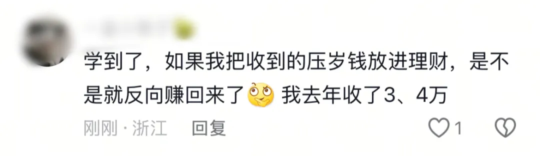 但也有浙江网友举一反三,如果能用理财收益覆盖一部分压岁钱损耗,那么反过来是不是也可以?小编眼前一亮,豁然开朗。