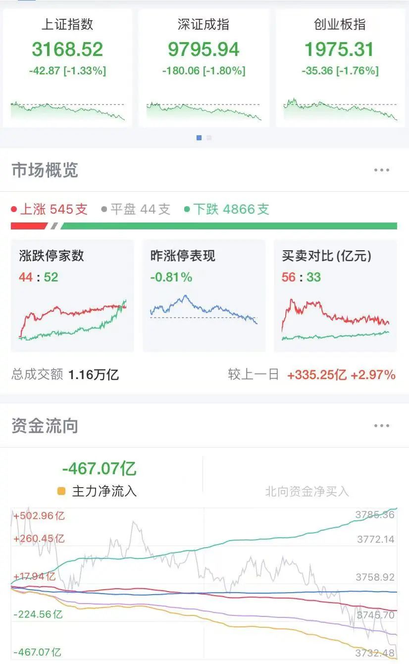 沪深京三市上涨个股1545只,涨停44只,下跌个股4866只,跌停52只。沪深京三市成交额1.16万亿元。
