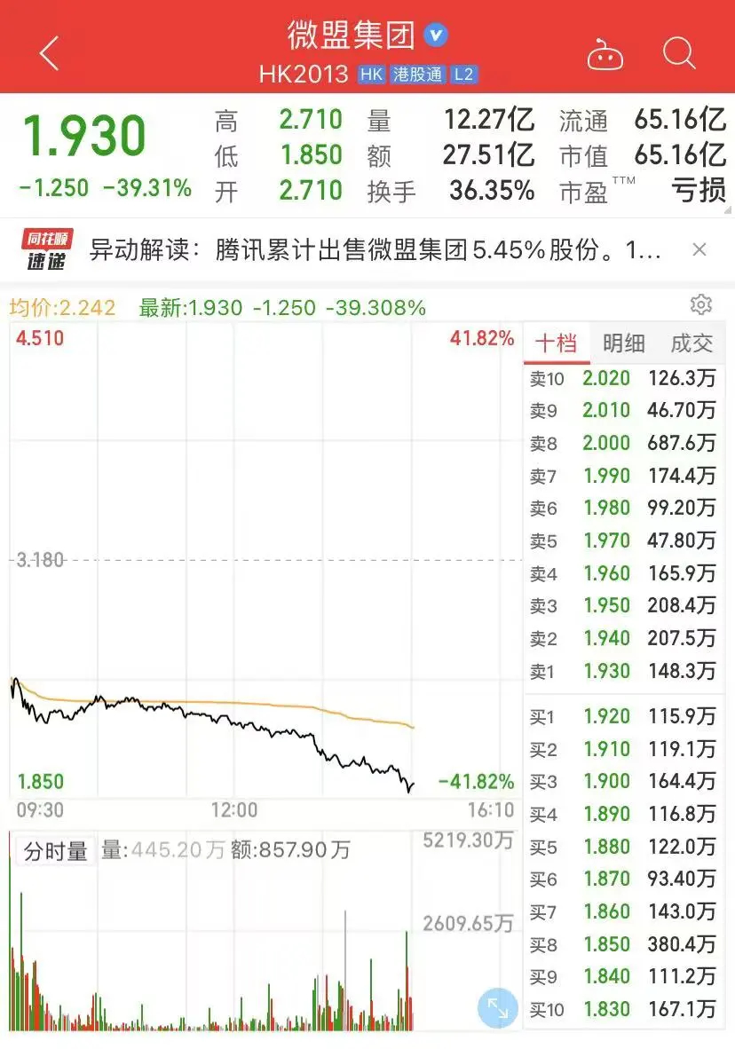 港股微盟集团(02013.HK)盘中跌超41%,截至发稿跌39.3%,报1.93港元/股,成交额超27亿港元,总市值65亿港元。