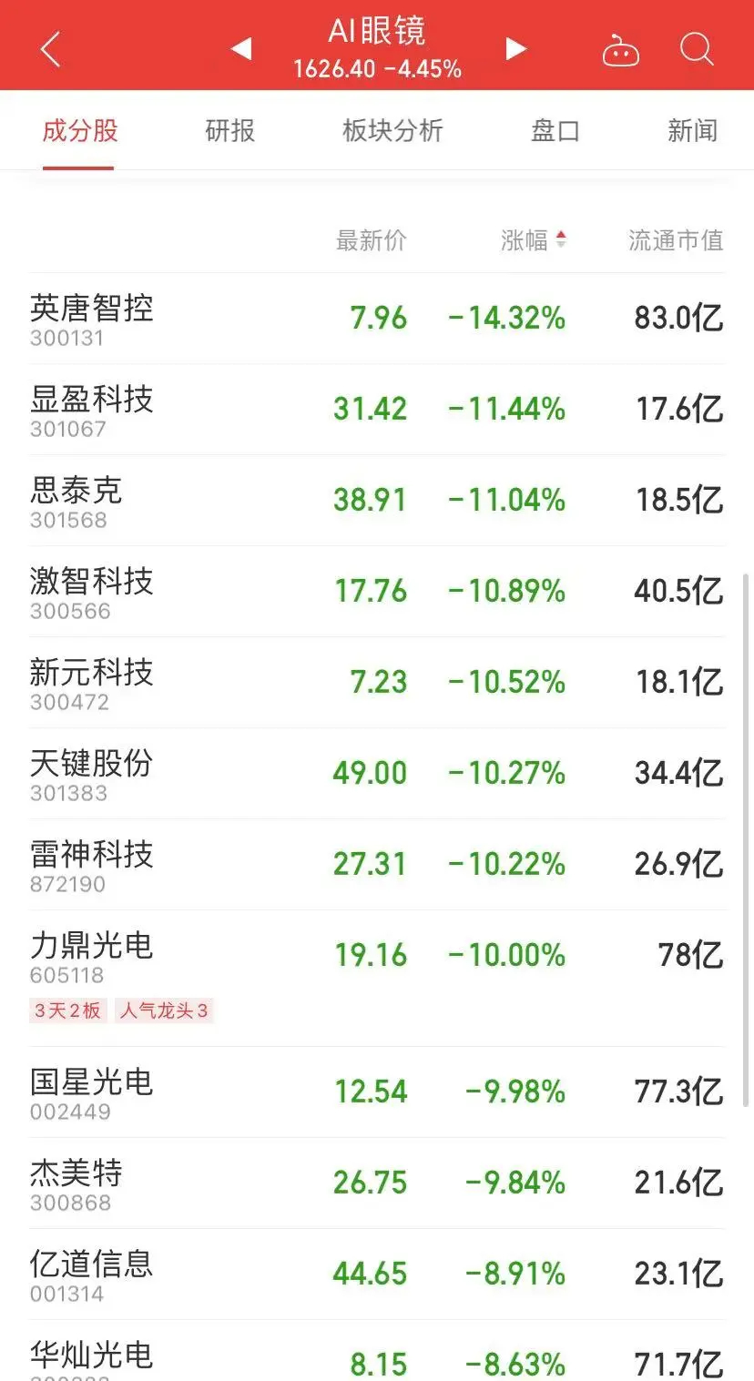 AI眼镜概念股震荡走低,国星光电、力鼎光电跌停,思泰克、显盈科技、激智科技等多股跌超10%。