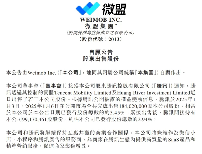 昨日晚间,微盟集团亦发布公告称,公司和腾讯将继续保持互惠共赢的商业合作关系。公司将继续作为微信小店、小程序和腾讯广告的服务商,为商家在腾讯生态内提供高质量的SaaS产品和精准营销服务,促进商家业务增长。