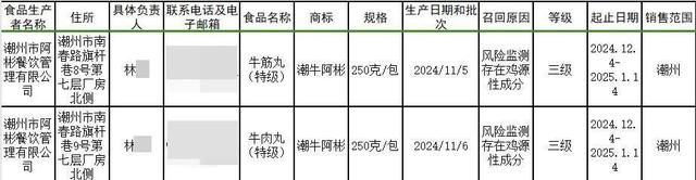 近日,潮州市市场监督管理局发布关于2024年12月生产环节不安全食品召回的通告,其中,潮州市阿彬餐饮管理有限公司生产的牛筋丸、牛肉丸被要求召回,原因均为“风险监测存在鸡源性成分”。