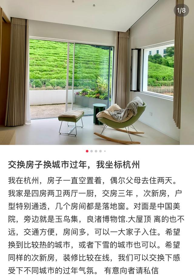 最近一段时间,社交媒体上已经有人开始发帖:“家在西安,想和南方的小伙伴互换房屋过年”“坐标新疆,有没有广州互换的小伙伴”……