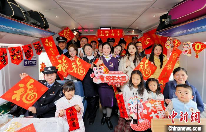 在上海南开往上海虹桥的G8387次“超级环线”高铁列车上,杭州客运段的文艺骨干为旅客带来了歌曲《小美满》、舞蹈《新年快乐》等节目;杭州乘警支队在车上开展了普法宣传;途中间隙,身着汉服的工作人员与旅客携手拓福字,并为大家送上蛇年吉祥物。