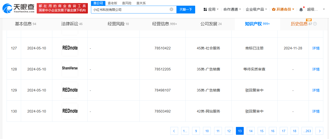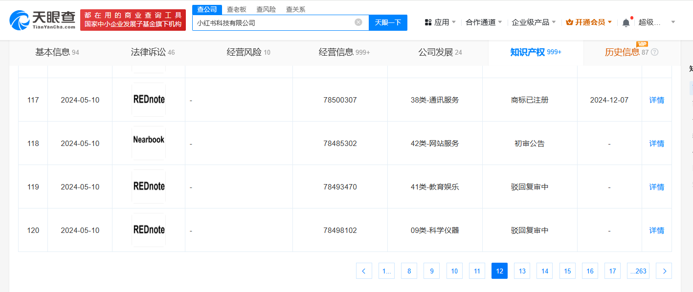 天眼查App显示,小红书科技有限公司已于2024年5月申请注册多枚“REDnote”商标,国际分类涉及通讯服务、教育娱乐、科学仪器等。近期,该公司申请的通讯服务、社会服务类“REDnote”已成功注册,其余商标均已被驳回复审。