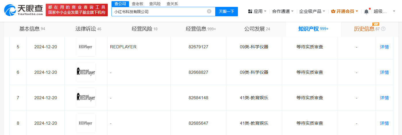 值得注意的是,近日,小红书科技有限公司申请注册了多枚“REDPlayer”商标,国际分类涉及科学仪器、教育娱乐,当前商标状态均为等待实质审查。