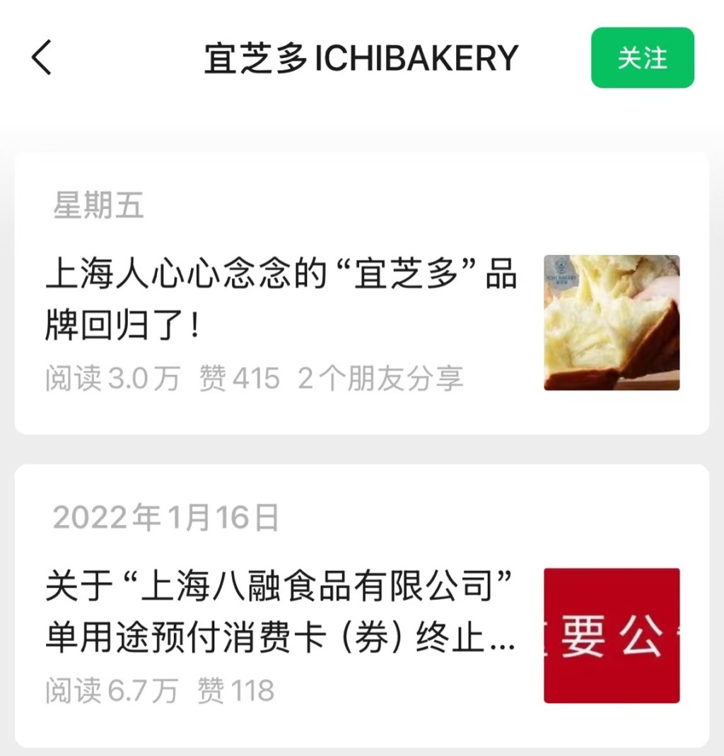在“宜芝多”官方微信号上,2022年1月发布了消费卡(券)理赔的公告后,一度停止了更新。