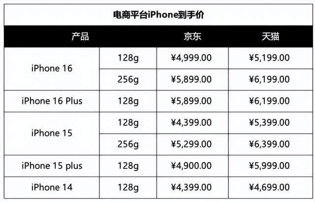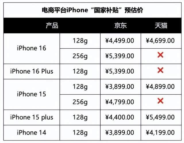 以128G的iPhone 16为例,京东价4999元,享受“国家补贴”15%优惠再减500元,最终到手价为4499元。天猫价5199元,使用国家补贴后的价格预估是4699元。128G版的iPhone 15,京东页面价4399元,叠加国家补贴后的价格预估是3899元,天猫页面价5399元,叠加国家补贴后的价格是4899元。此外,消费日报网也根据国家补贴规则,预估了两大平台iPhone到手价,具体的到手价还需等20日见分晓。