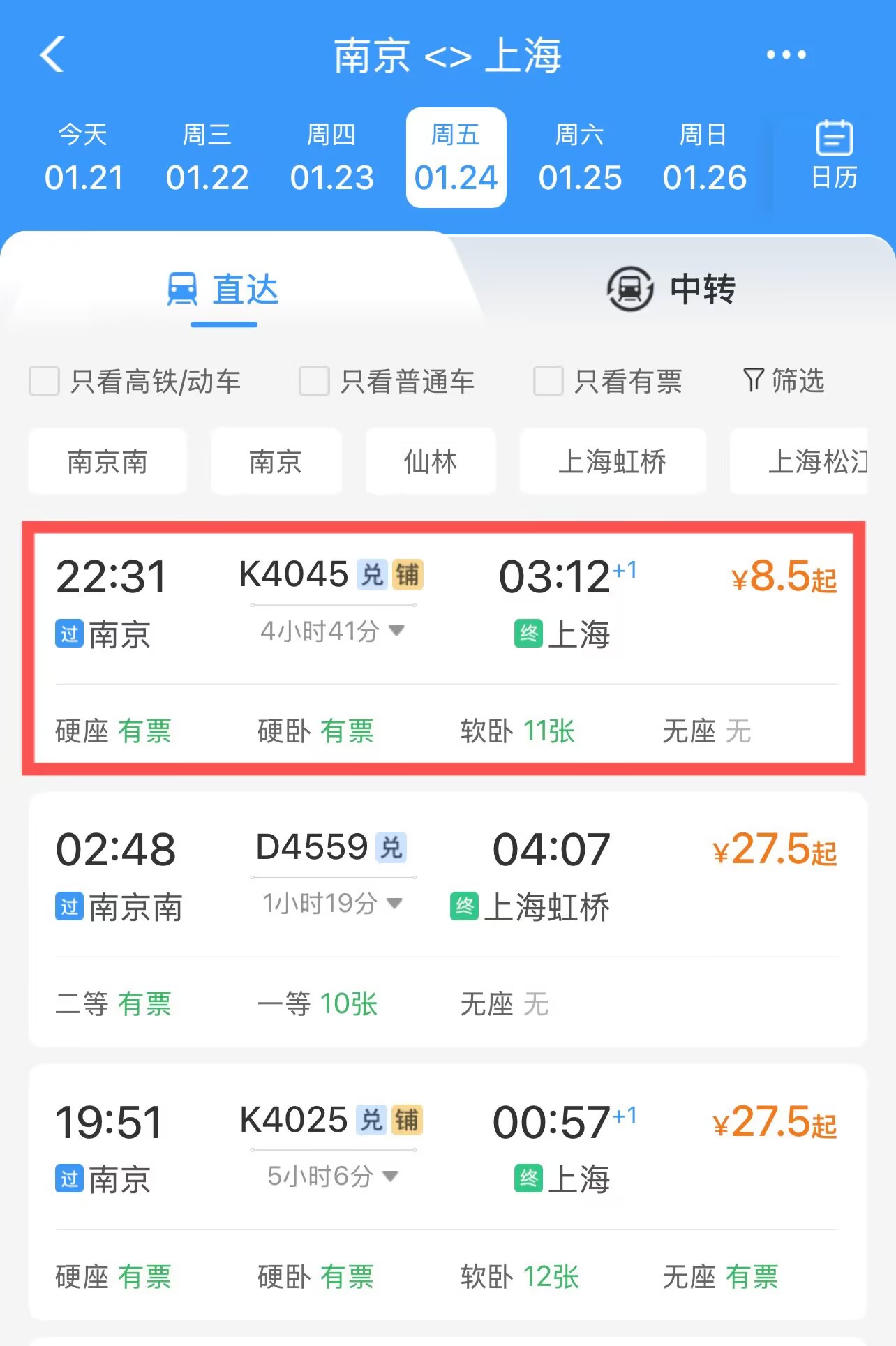 铁路12306显示,南京到上海的K4045次,硬座票价8.5元,相当于1.9折。不过,这趟车行程时间4小时41分钟,让网友忍不住吐槽“没有性价比”。现代快报记者注意到,这趟车不是每天都有,年前从1月22日至1月26日有。同样是这趟K4045次列车,徐州到南京的硬座票价是9.5元,行程时间5小时44分钟。