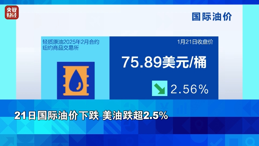 国际油价周二明显下跌,主要原因是美国总统特朗普明确表达了他加倍推动化石燃料发展的意图,并称将宣布美国进入“国家能源紧急状态”,试图撤销拜登对海上钻探的限制。这些消息提高了投资者对原油供应增加的预期,国际油价应声下跌。截至周二收盘,纽约商品交易所2月交货的轻质原油期货价格收于每桶75.89美元,跌幅为2.56%;3月交货的伦敦布伦特原油期货价格收于每桶79.29美元,跌幅为1.07%。