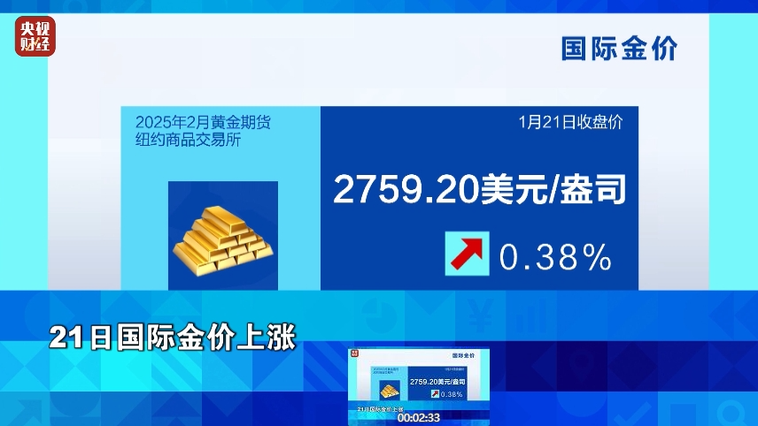 在美国可能征收关税的不确定性影响下,市场涌向避险资产黄金,国际金价周二上涨,纽商所2月黄金期价上涨0.38%,报2759.20美元/盎司。