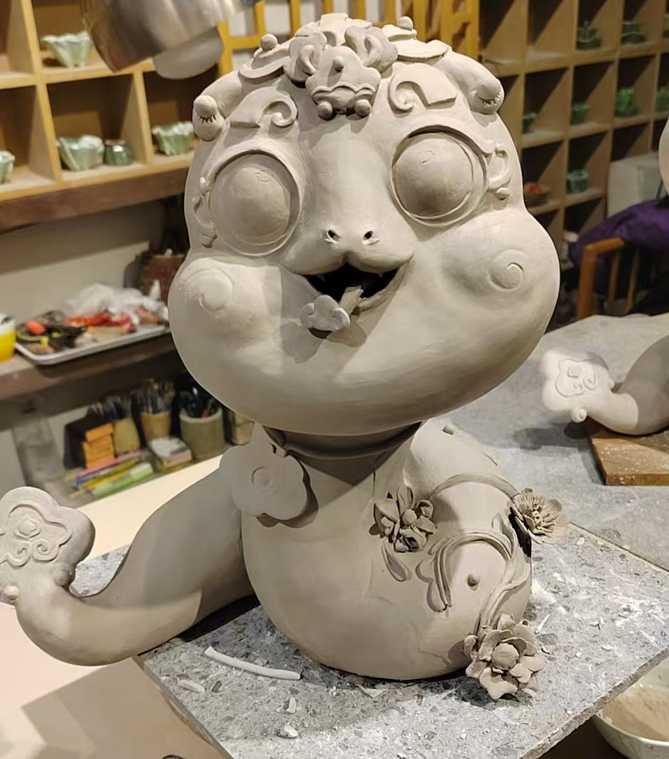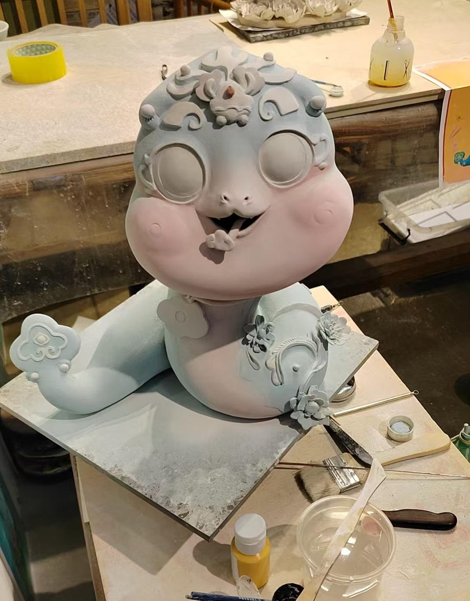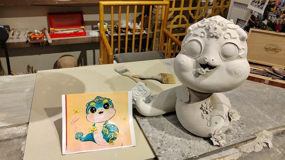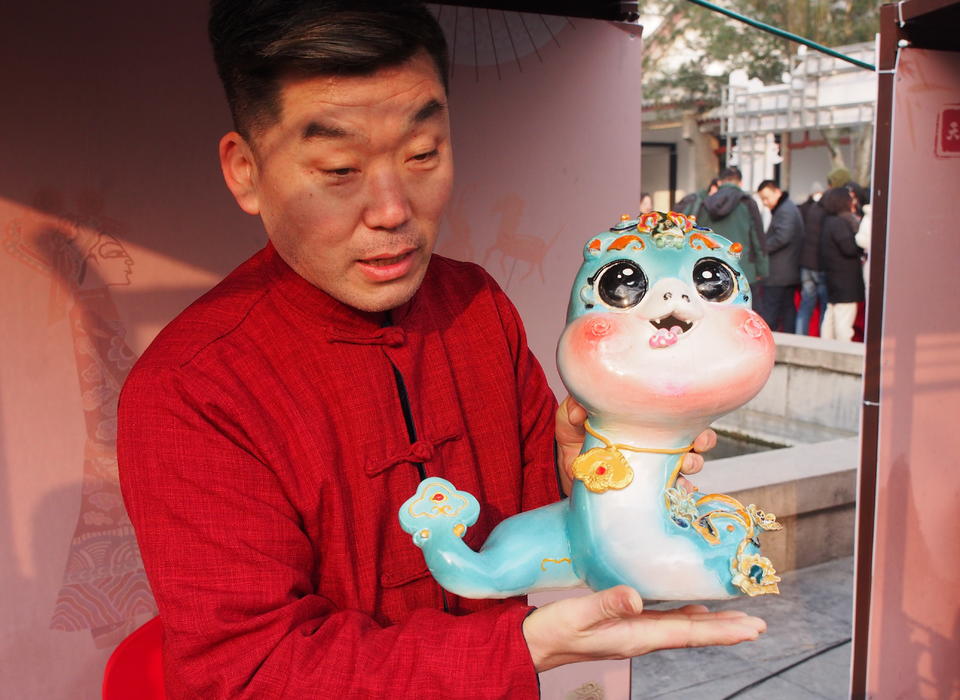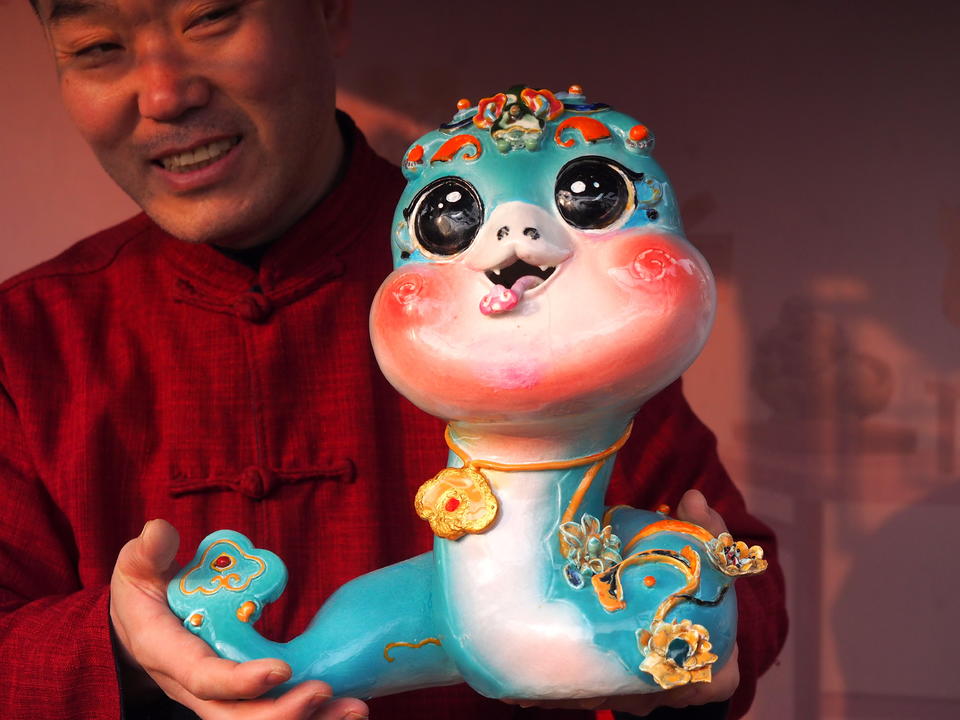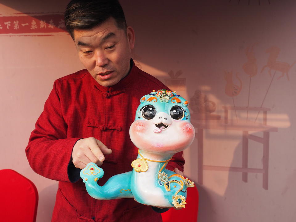1月22日,农历小年,济南陶塑非遗传承人王令涛制作的春晚吉祥物“巳升升”公开展出,让很多观众感到十分喜爱,孩子们更是围着它团团转。