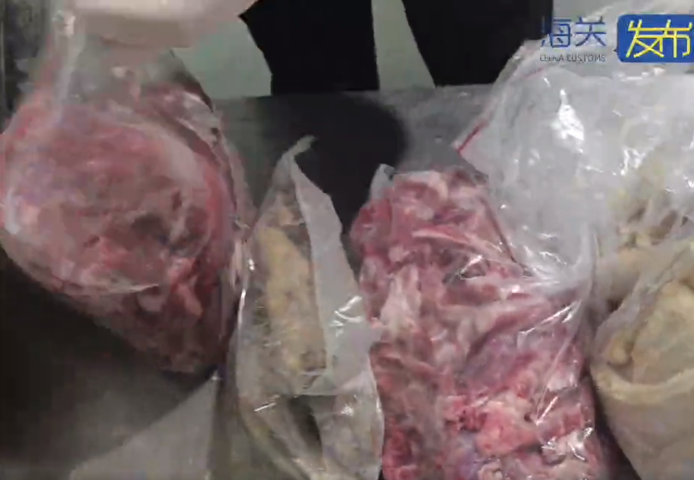 近日,重庆江北机场海关在对进境航班进行监管时,发现一件行李存在异常。经开箱查验,现场关员在该行李箱内发现6袋肉制品,包括冷冻牛肉、牛肚、羊肉等,重18.68千克。海关已依法对该批肉类制品作截留销毁处理。