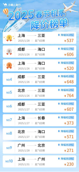 去哪儿平台显示,1月26日-28日部分热门航线机票价格比春运高峰期便宜超500元。以北京-三亚航线为例,1月25日北京出发直飞价格为1965元,之后逐渐走低:1月26日出发最低1700元,1月28日(除夕)当天出发最低1159元。这一价格走势与往年春节期间机票价格普遍上涨的情况形成了鲜明对比。