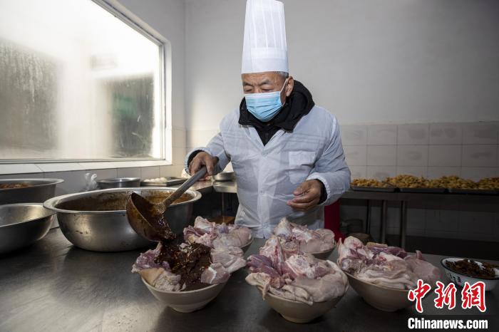 “六百多年前,大荔县交通便利,商贾云集,多个民族交融,催生了九品十三花,带把肘子就是其中的一道名菜。古时上至官府、下至民间的宴席,带把肘子是必不可少的菜品。”在雷川海配料的间隙,他的儿子雷宏向记者讲起了带把肘子的渊源,在当地人心里,带把肘子是富贵吉祥的象征。