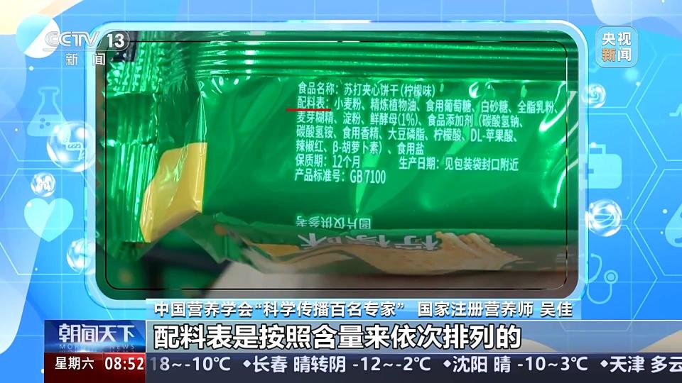 中国营养学会“科学传播百名专家” 国家注册营养师 吴佳:配料表是按照它的含量来依次排列的。我们看这个配料表,你吃得最多的就是小麦粉、植物油,还有葡萄糖和白砂糖。我们再看看这个不是柠檬味的饼干吗,能不能找一找柠檬在哪里,其实我们发现它里边一点柠檬也没有,它可能用的就是柠檬酸,还有苹果酸一起来配合调制出的柠檬的味道。
