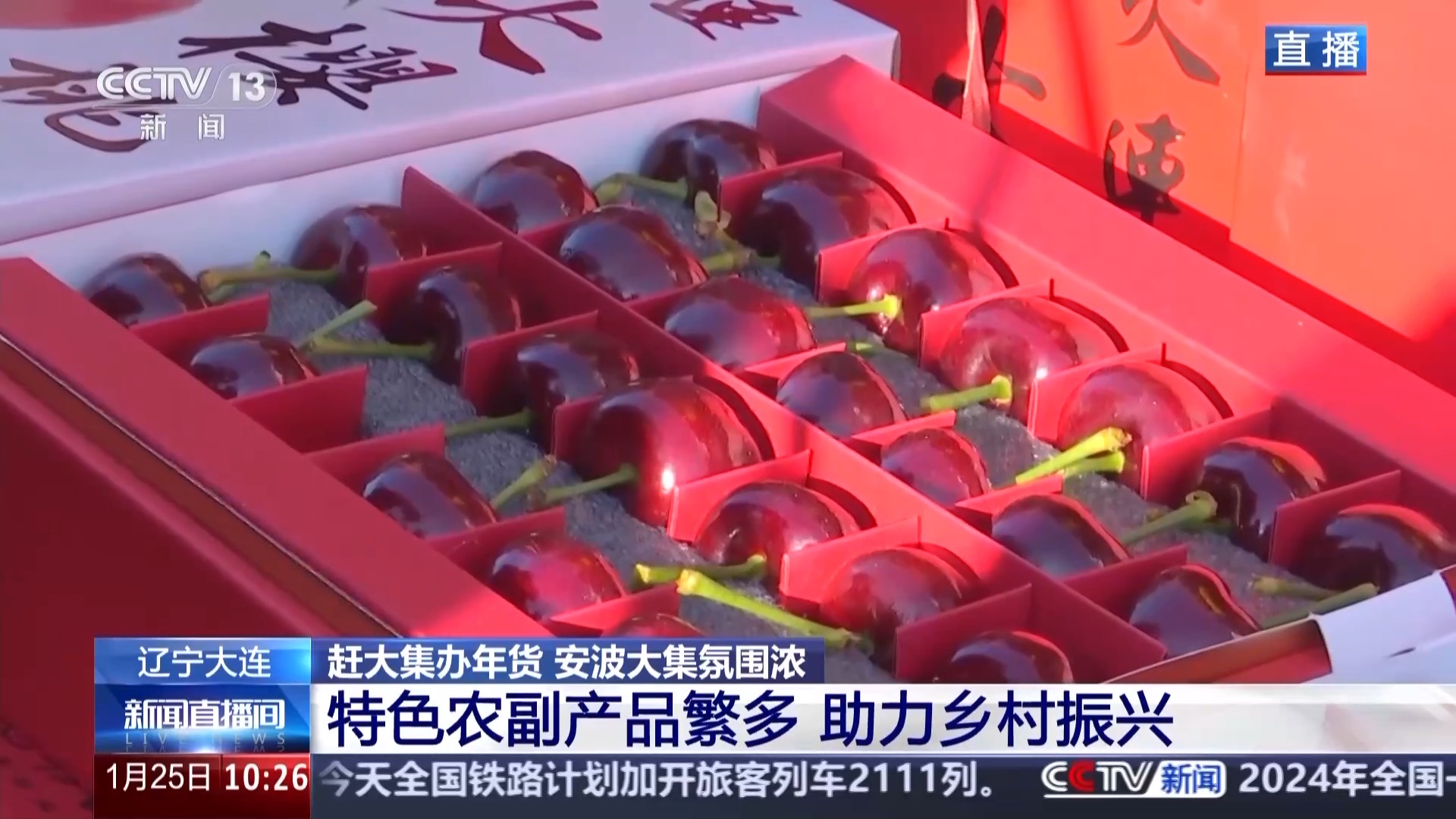 总台记者陶泽文:同样卖得特别好的还有四平大樱桃,四平是指这里的四平街道。近4000座新型大棚通过智能控温和空调进棚方式,实现樱桃最早在元旦前后就能上市,个大味美的四平大樱桃为大家春节的餐桌增添一份甜美。