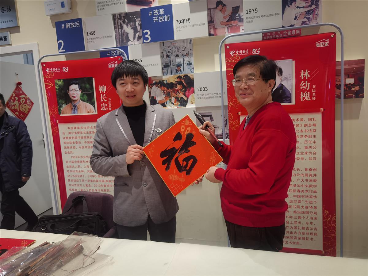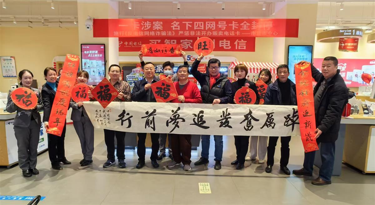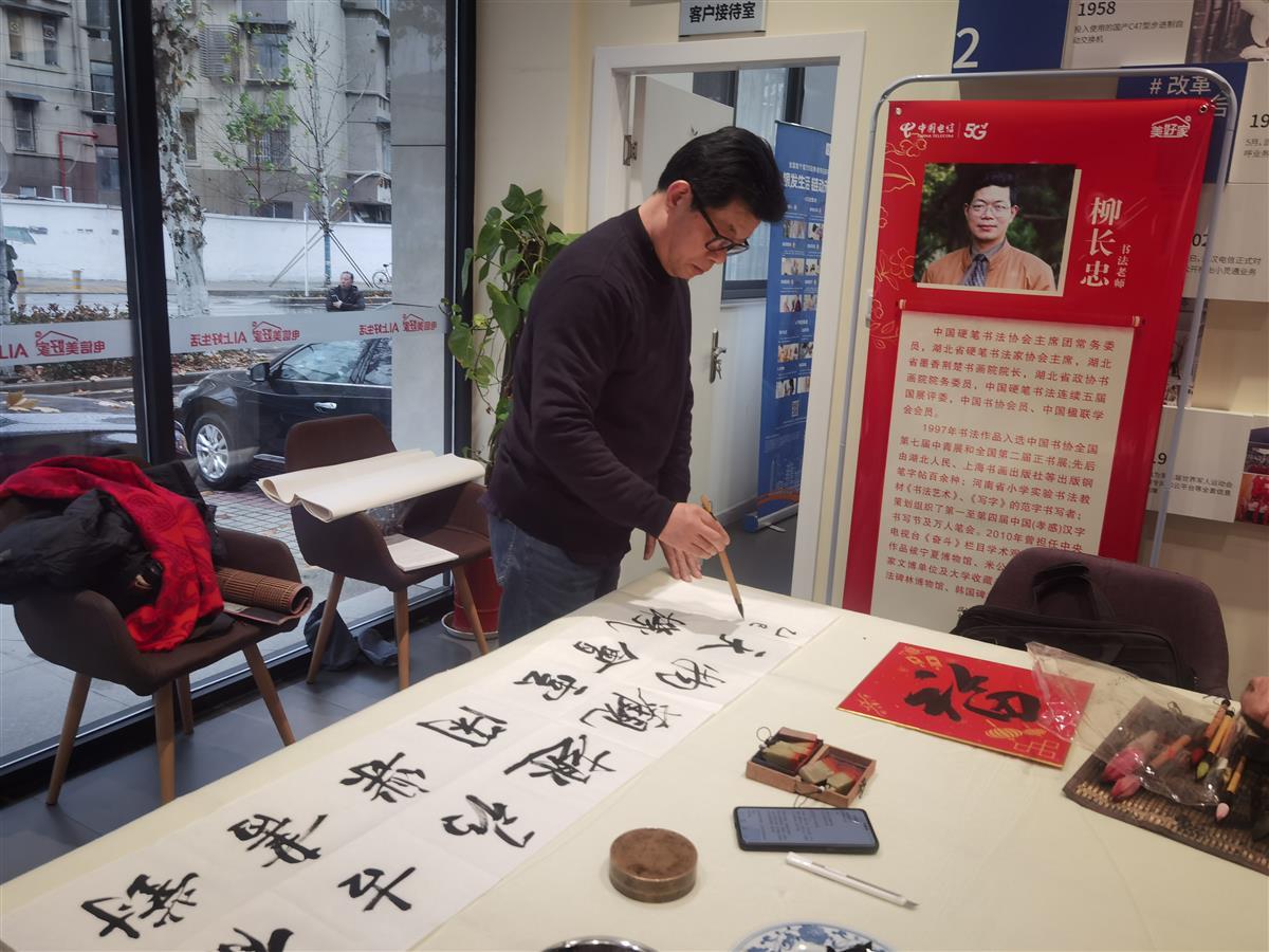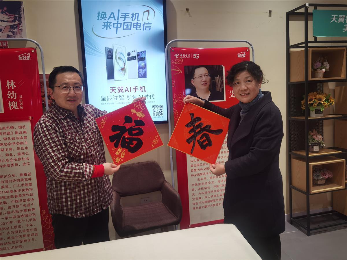 2025年1月25日,距离乙巳新年仅有寥寥数日,在这寒风凛冽的时节,国家一级美术师、湖北天翼书画家协会主席林幼槐,湖北省硬笔书法家协会主席、湖北省政协书画院院务委员柳长忠,湖北省硬笔书法家协会副主席、湖北天翼书画家协会秘书长陈艾等三位知名书法家,顶着严寒,走进了武汉市街道口电信营业厅,开展了一场温馨暖人的写春联送祝福活动,为节日期间坚守岗位的电信员工和用户送上了真挚的新春问候。