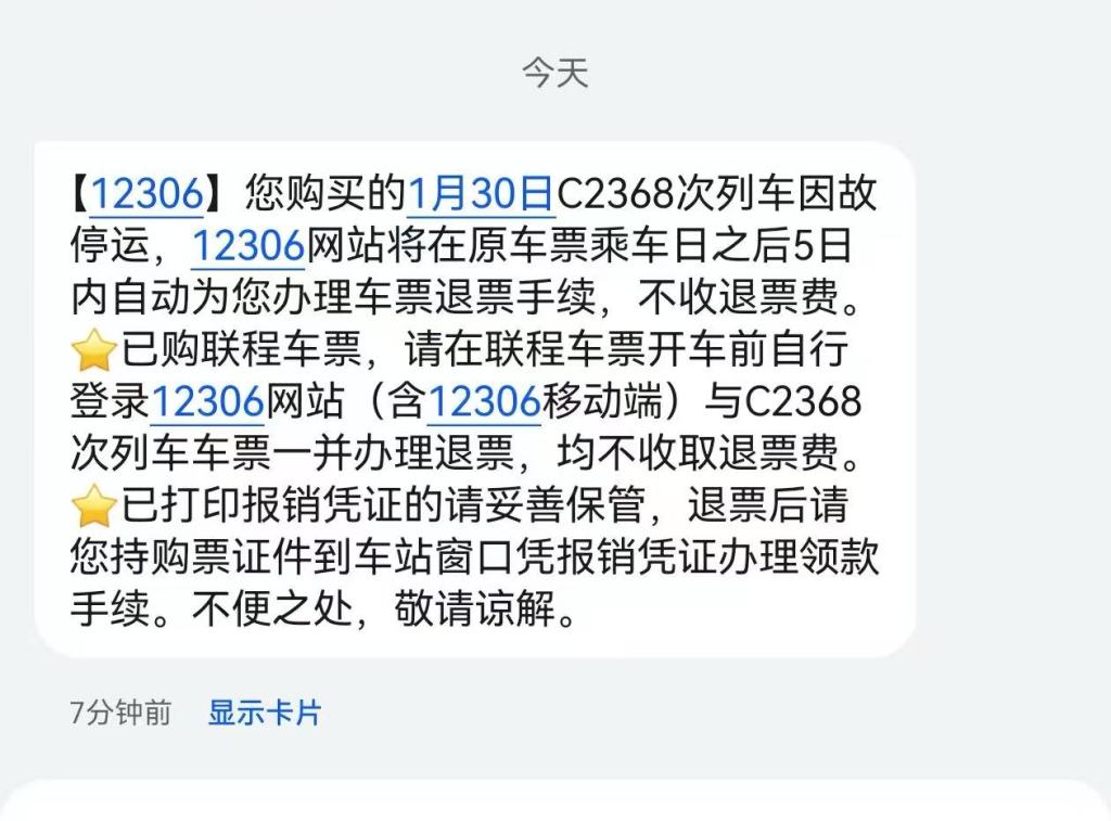 “之后我们就按照既定计划准备了。”李丽称,1月21日下午,她突然收到12306发来的短信,短信显示:“C2368次列车因故停运,12306网站将在原车票乘车日之后5日内自动为您办理车票退票手续,不收退票费。”