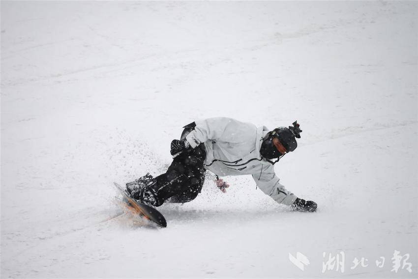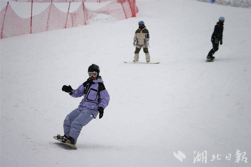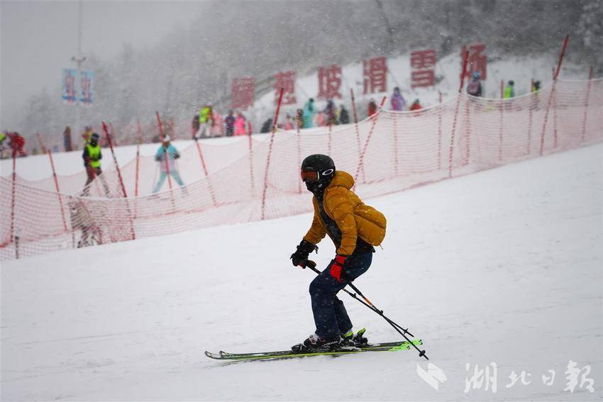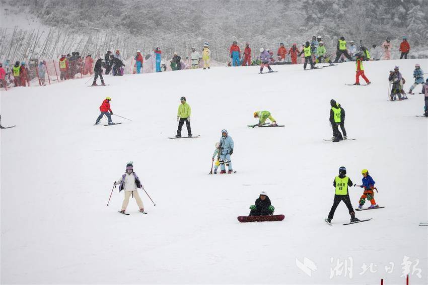 2月1日,大年初四,巴东绿葱坡滑雪场大雪纷飞,滑雪爱好者身着鲜艳的滑雪服,从高处飞驰而下,溅起层层雪雾。