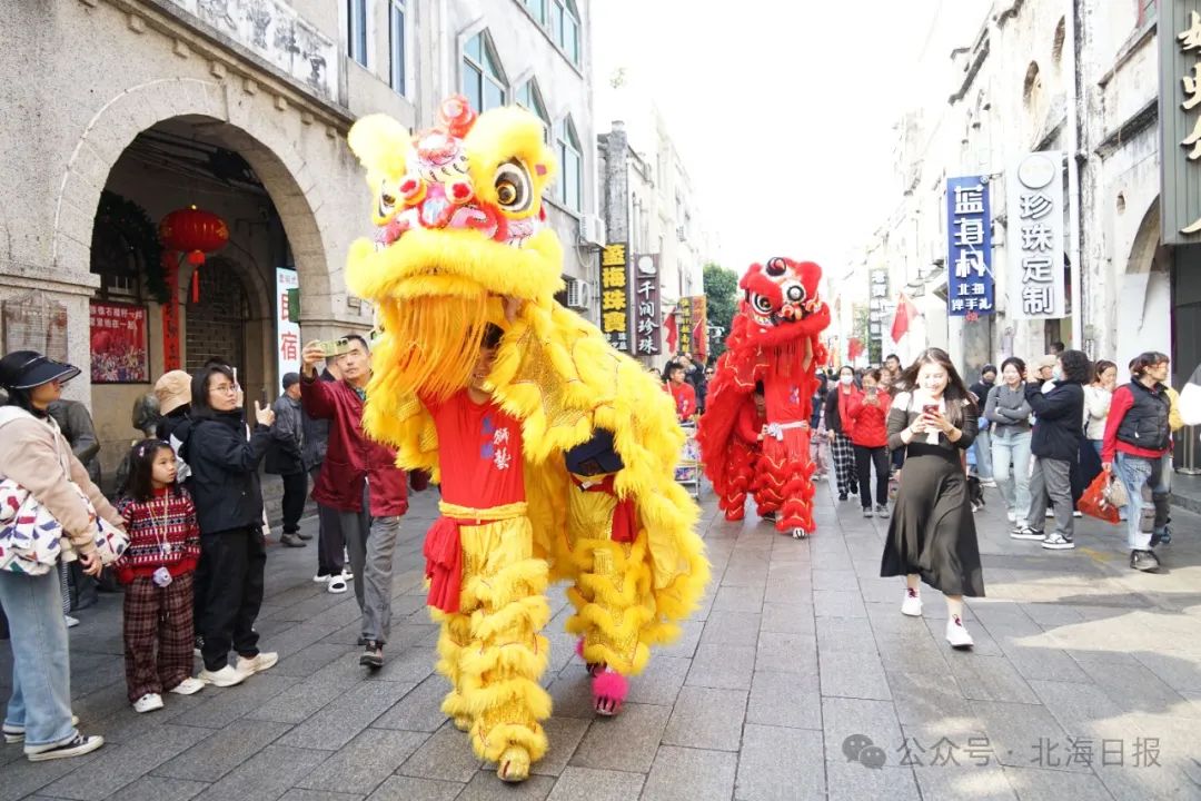 北海老城的舞狮队一边表演一边和市民游客互动。蒋兴媚 摄