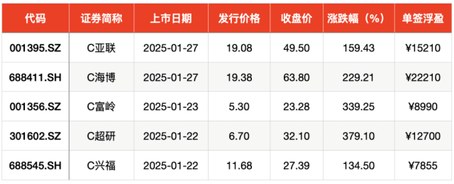 1月20日至1月27日期间,共有5只新股上市,分别为湖北兴福电子材料股份有限公司(简称“兴福电子”,688545.SH)、汕头市超声仪器研究所股份有限公司(简称“超研股份”,301602.SZ)、富岭科技股份有限公司(简称“富岭股份”,001356.SZ)、北京海博思创科技股份有限公司(简称“海博思创”,688411.SH)、亚联机械股份有限公司(简称“亚联机械”,001395.SZ)。