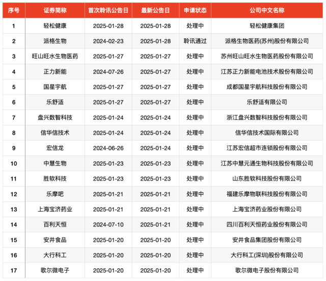 1月20日至1月27日期间,港股迎来16家企业申报,其中首次申报的企业合计13家,包括轻松健康集团、苏州旺山旺水生物医药股份有限公司、成都国星宇航科技股份有限公司、乐舒适有限公司、浙江盘兴数智科技股份有限公司、信华信技术国际有限公司、江苏中慧元通生物科技股份有限公司、山东胜软科技股份有限公司、福建乐摩物联科技股份有限公司、上海宝济药业股份有限公司、安井食品集团股份有限公司、大行科工(深圳)股份有限公司、歌尔微电子股份有限公司。此外共有3家企业更新招股书,分别为江苏正力新能电池技术股份有限公司、江苏宏信超市连锁股份有限公司、四川百利天恒药业股份有限公司。