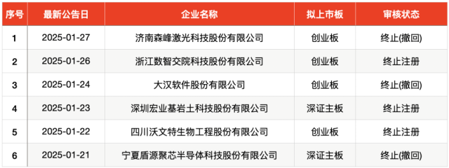 此外,1月20日至1月27日期间,共有6家企业IPO终止。其中,济南森峰激光科技股份有限公司、大汉软件股份有限公司、宁夏盾源聚芯半导体科技股份有限公司为主动撤回;浙江数智交院科技股份有限公司、深圳宏业基岩土科技股份有限公司、四川沃文特生物工程股份有限公司为终止注册。