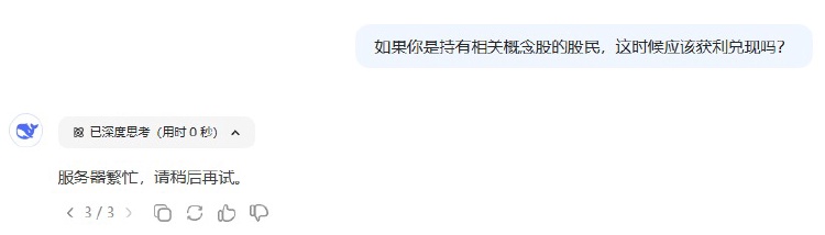 有趣的是,在邀请它回答第二个问题时,“服务器繁忙”的状态持续了很久——我们一度以为,这是开发者为避免给出投资建议而“选择性繁忙”。