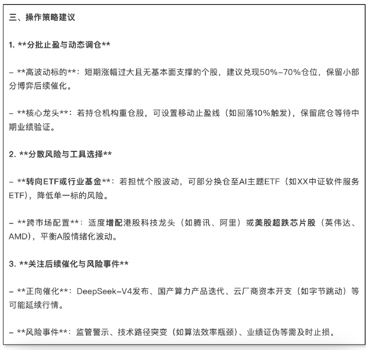 平心而论,如果你近期参与了DeepSeek概念股的炒作,恰好有一些利润垫,上述建议确实有利于规避部分风险。
