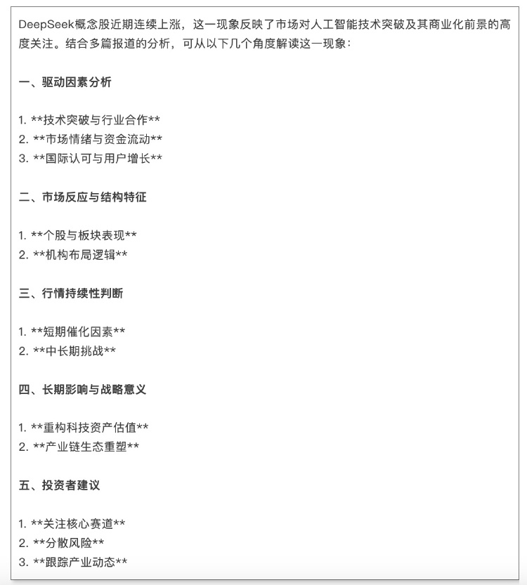 “DeepSeek概念股的爆发是技术突破、政策支持与市场情绪共振的结果,短期热度可能延续,但中长期需回归基本面验证。投资者应理性区分技术红利与泡沫,把握AI赋能实体经济的核心逻辑。”