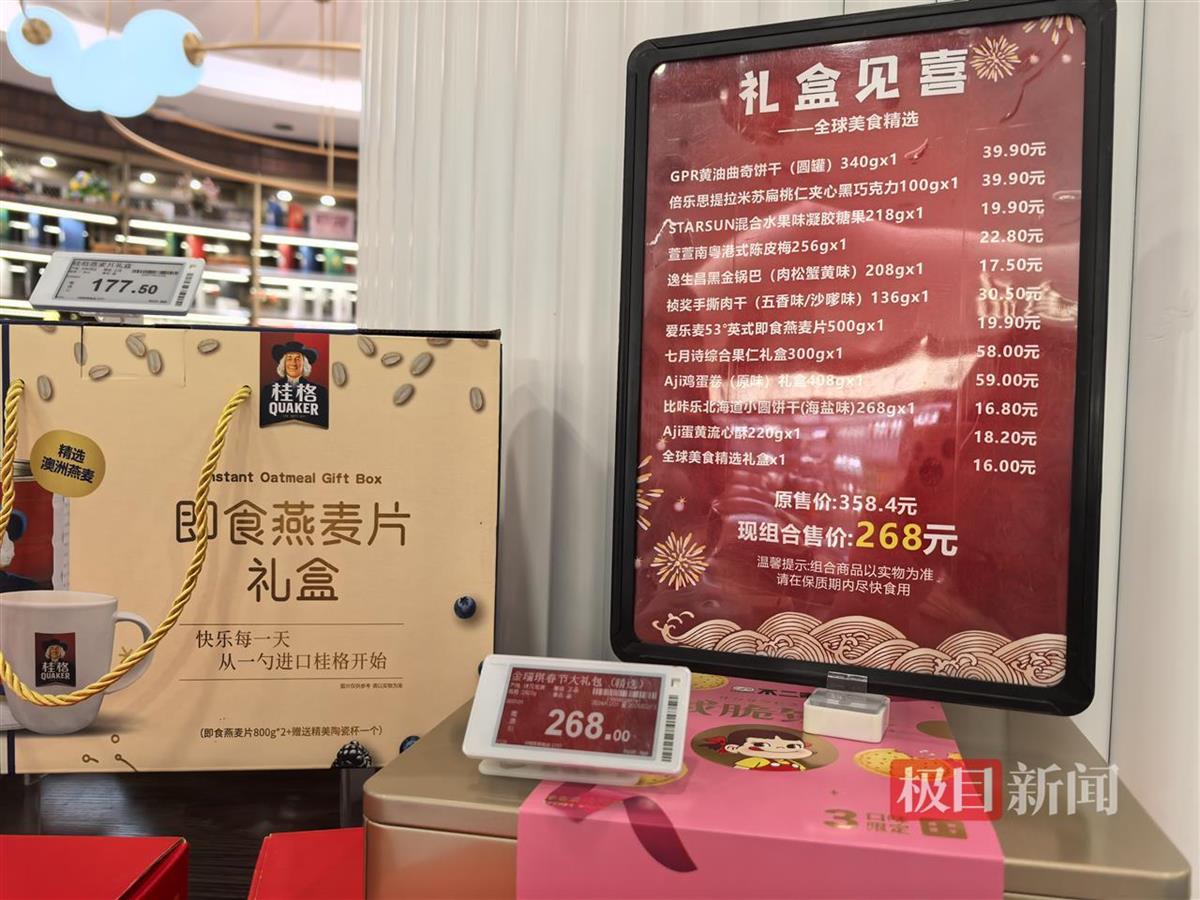 武商超级生活馆内,原价358.4元的零食大礼包,降为268元(极目新闻记者石倩摄)