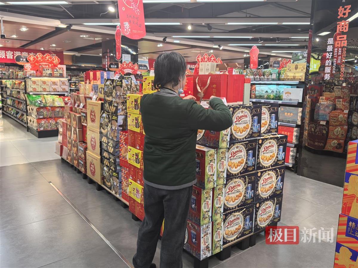 中商优品汇超市的新年礼盒货架上,超市工作人员正在理货(极目新闻记者石倩摄)
