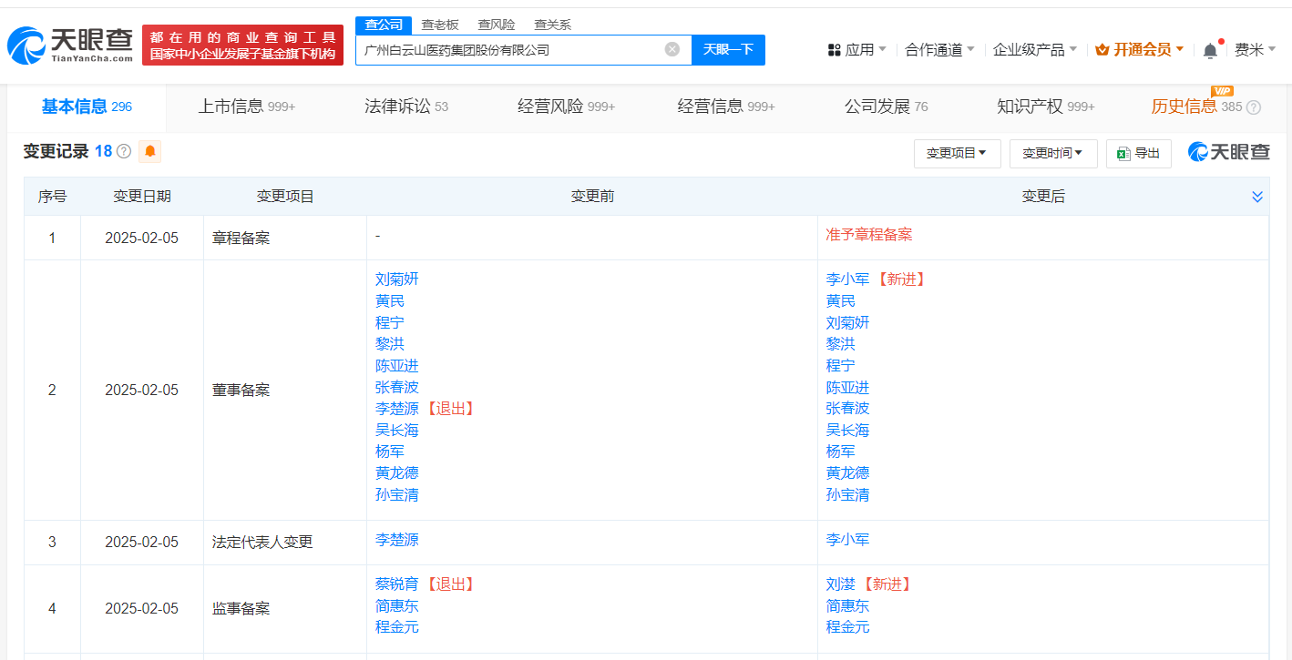 天眼查App显示,近日,白云山发生工商变更,李楚源卸任法定代表人、董事长,由李小军接任,同时,部分主要人员也发生变更。