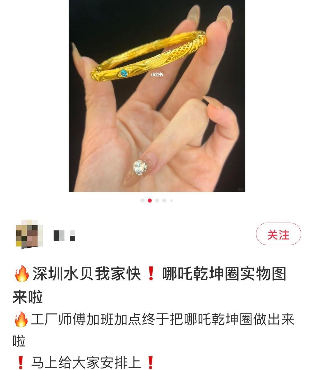 有网友晒出五年前《哪吒之魔童降世》(又名《哪吒1》)的联名金手镯,发现已成理财产品,当时60g左右的金手镯2.8万元,如今随着IP的增值和金价的升高,价格已经翻倍。2月10日,红星新闻记者通过淘宝、小红书等平台发现,不少水贝商家贴出定制预售广告,更有乾坤圈实物样品的视频贴出,供线上消费者选购。