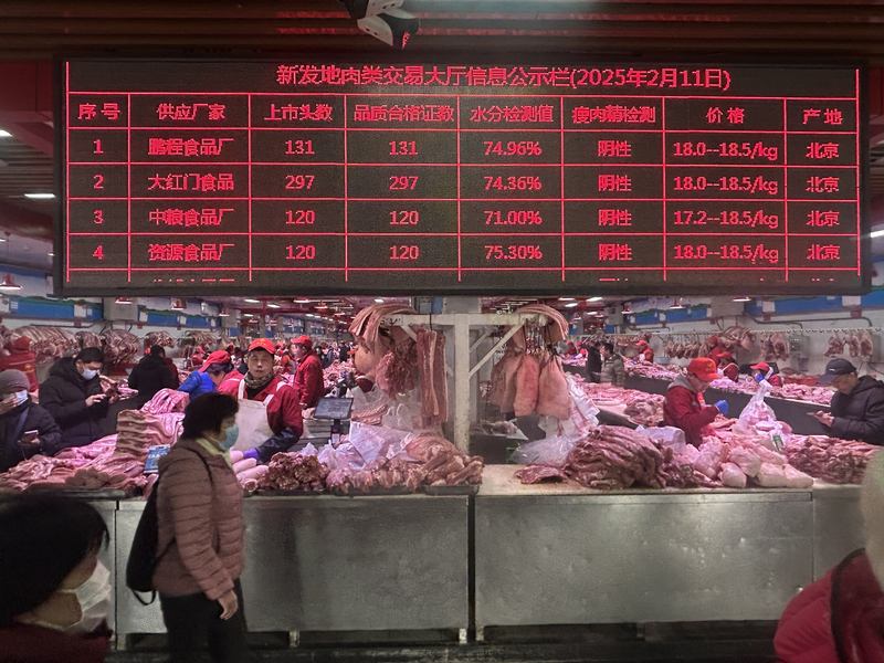 新发地肉类交易大厅,猪肉价格回落,低于节前。新京报记者陈琳摄
