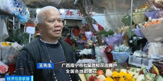 广西南宁市七星路鲜花店商户 王先生:价格涨了一倍多,天气凉,花长不大,用花又多,情人节、元宵节,全国各地都要花。