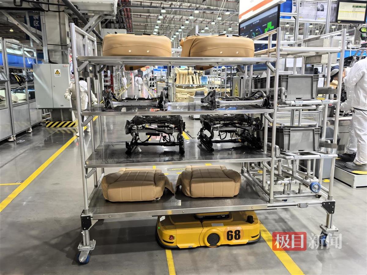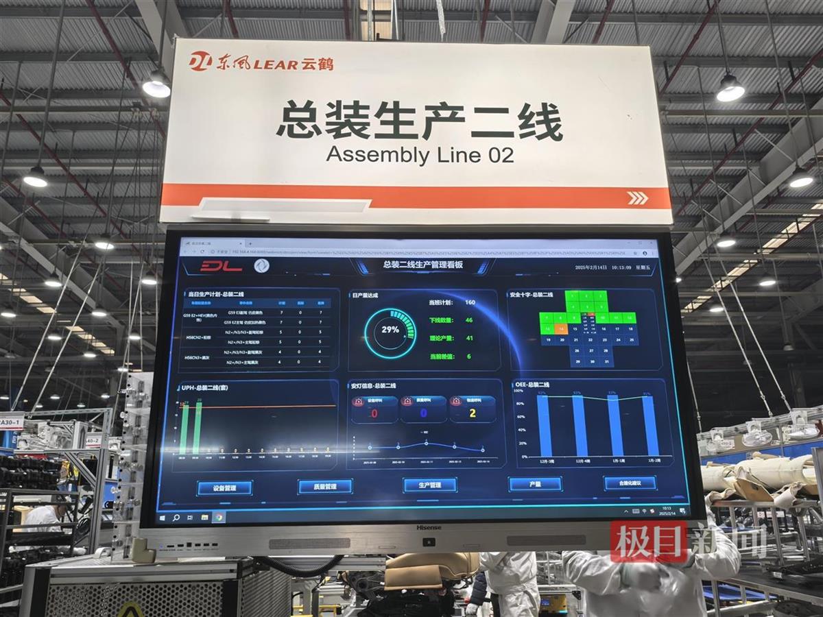 2月14日,极目新闻记者在该工厂看到,厂区的智能化程度非常高,总装生产共有17条线,每条线都有一块电子大屏,当日生产计划、日产量达成等数据一目了然;生产线上有机器臂协助人工操作,提升生产效率;AGV运输小车穿梭其间,极大地解放人力,提升物流运输效率。