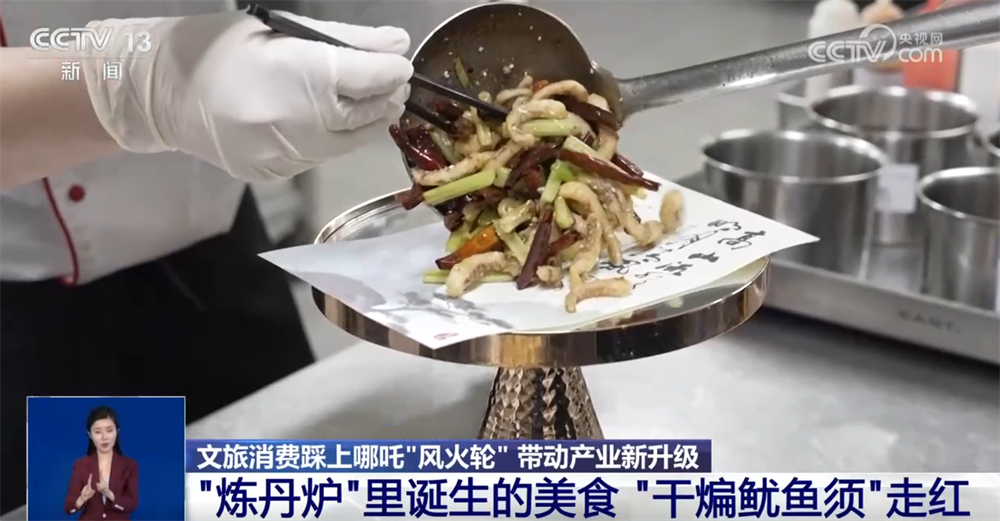 在天津这家酒店的餐厅里,记者看到了一份新鲜出炉的“哪吒”菜谱:“太乙手撕鸡”“混天绫拌海草”……在这当中,最受食客欢迎的是天津特色菜“干煸鱿鱼须”。许多游客看到菜单,就会想到说天津话的章鱼将军被炼丹炉烤熟的场景。