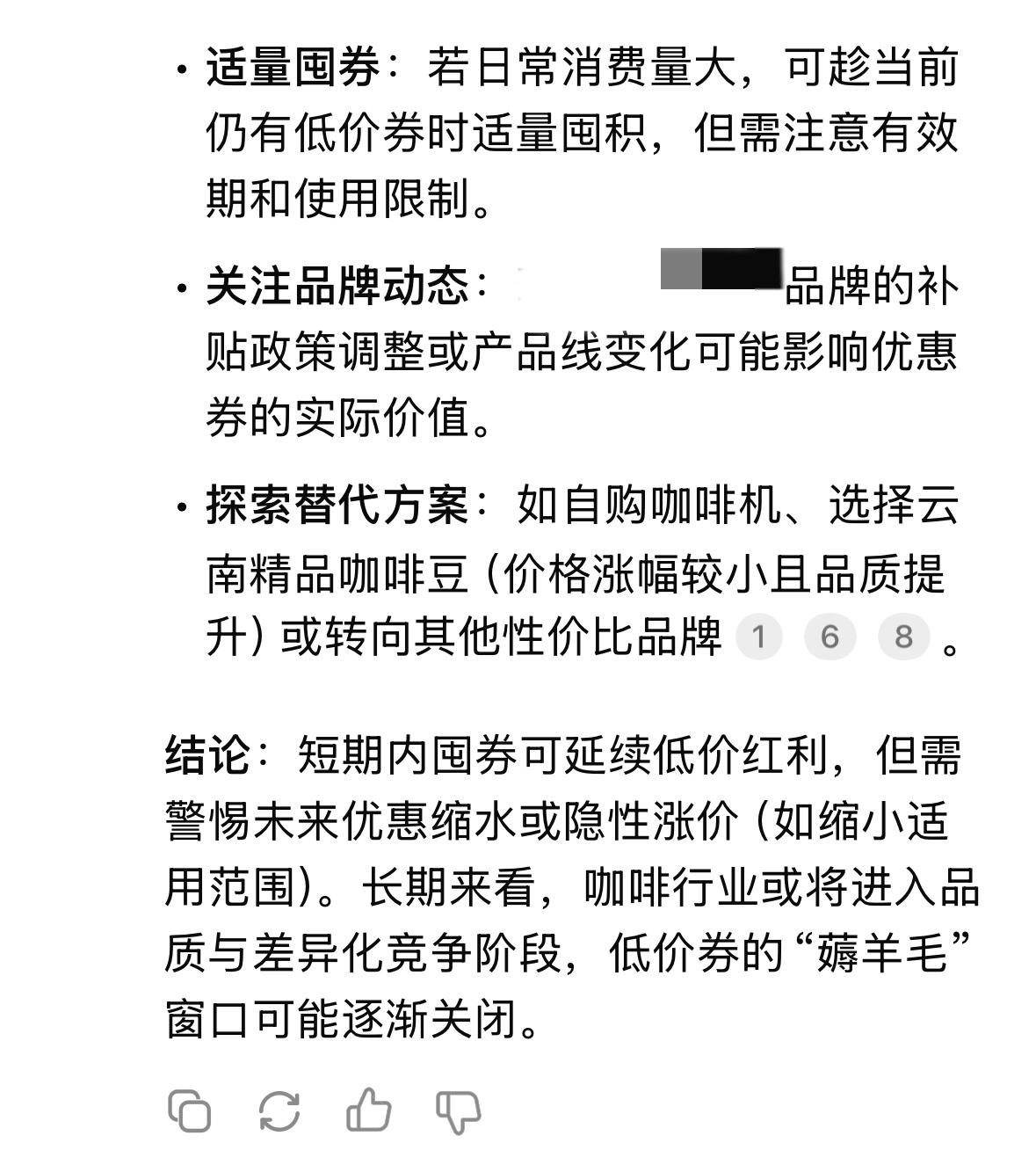 看现在这趋势,进口咖啡豆的价格可能还会继续上涨。有人欢喜有人愁,咖农的种植积极性越来越高,咖友能喝的低价咖啡的确不多了。关于到底要不要提前囤便宜的咖啡券?不妨看看DeepSeek给出的答案。