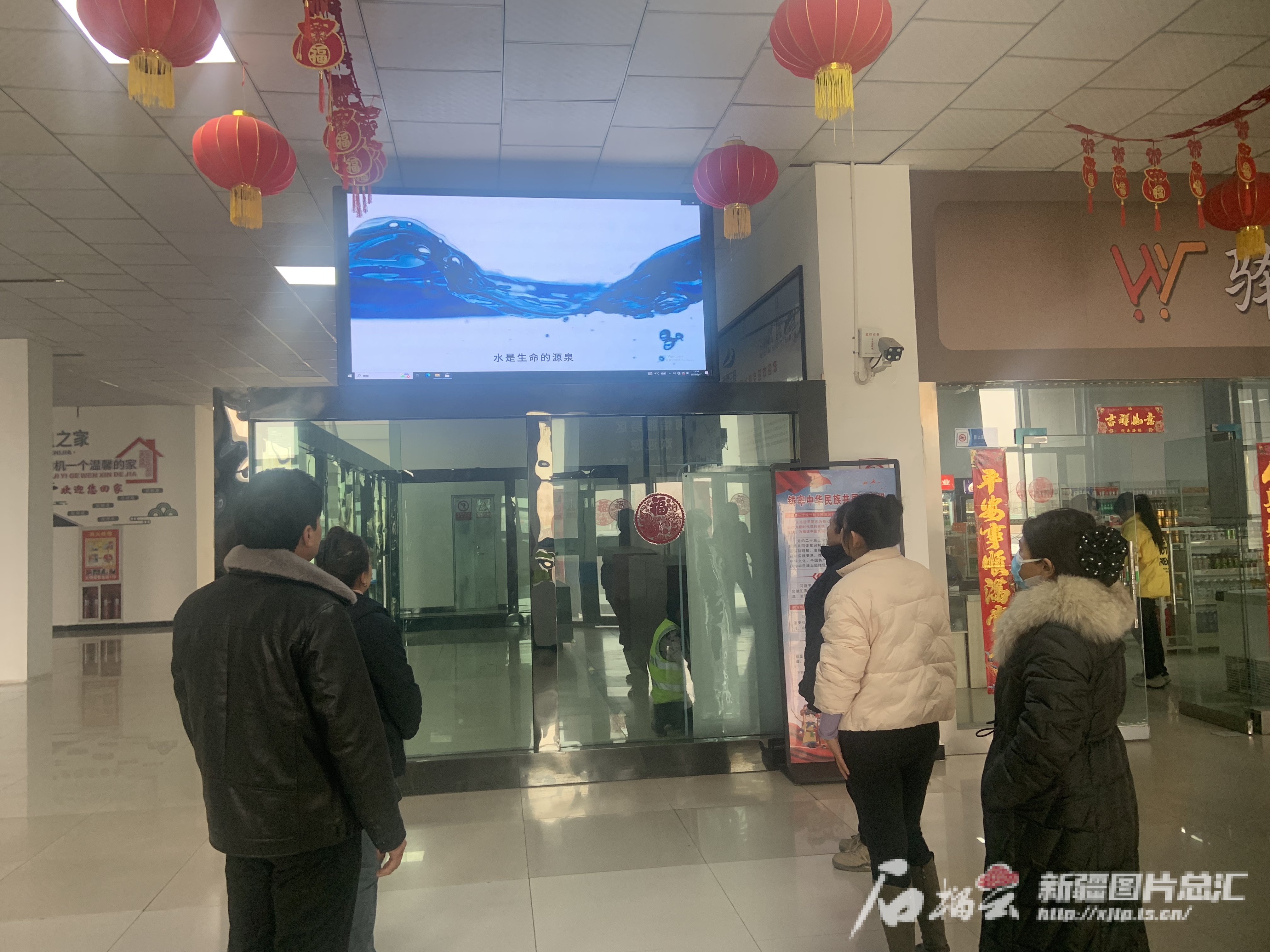 2月17日,G3012线吐和高速公路阿恰服务区内,旅客在新的显示屏前观看节水宣传片。李栋摄