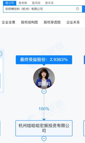 去年3月,宗馥莉接手了宗庆后持有的杭州娃哈哈宏振投资有限公司,后者通过多家公司间接持股宗师傅,这导致宗馥莉在宗师傅公司的最终受益股份为2.96%。