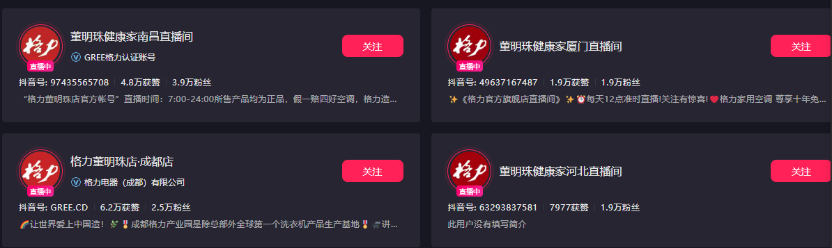 2020年4月,董明珠开启了线上直播生涯,在快手、抖音、京东等平台进行多场直播,同时也在全国多地开启巡回直播,在这一过程中,董明珠个人形象和格力电器的公司形象联系得越来越紧密。2024年3月,格力电器的官方公众号更名为“格力董明珠店”。