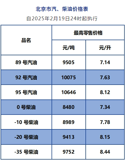 根据国家发展改革委国内成品油价格调整要求,按照成品油价格形成机制,本市汽、柴油最高零售价格自2025年2月19日24时起,每吨分别降低170元和160元。