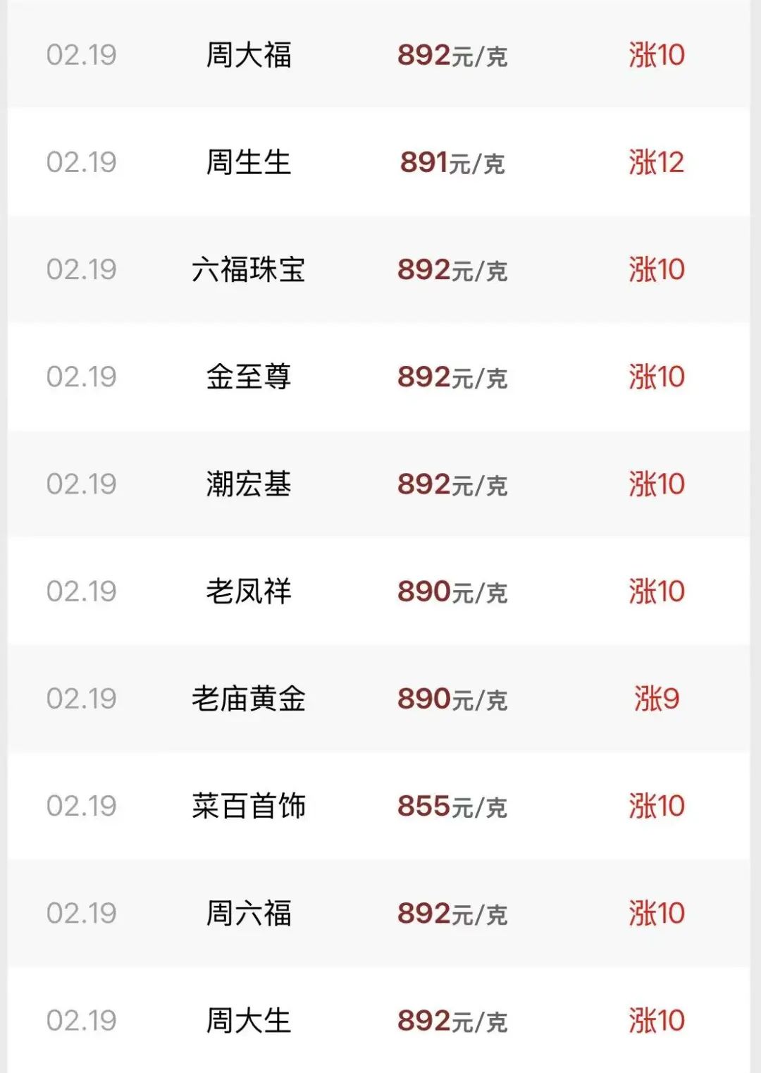 国内品牌金价来看,2月19日,周大福、六福珠宝、潮宏基、周大生等多个品牌的黄金价格一日上涨10元/克,均达到892元/克。其中周生生报价891元/克,较昨日的879元/克一夜上涨12元/克。