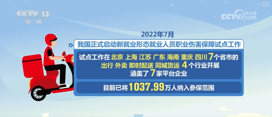 2022年7月,我国正式启动新就业形态就业人员职业伤害保障试点工作。试点工作在北京、上海、江苏、广东、海南、重庆、四川7个省市的出行、外卖、即时配送、同城货运4个行业开展,涵盖了7家平台企业。目前,已将1037.99万人纳入参保范围。
